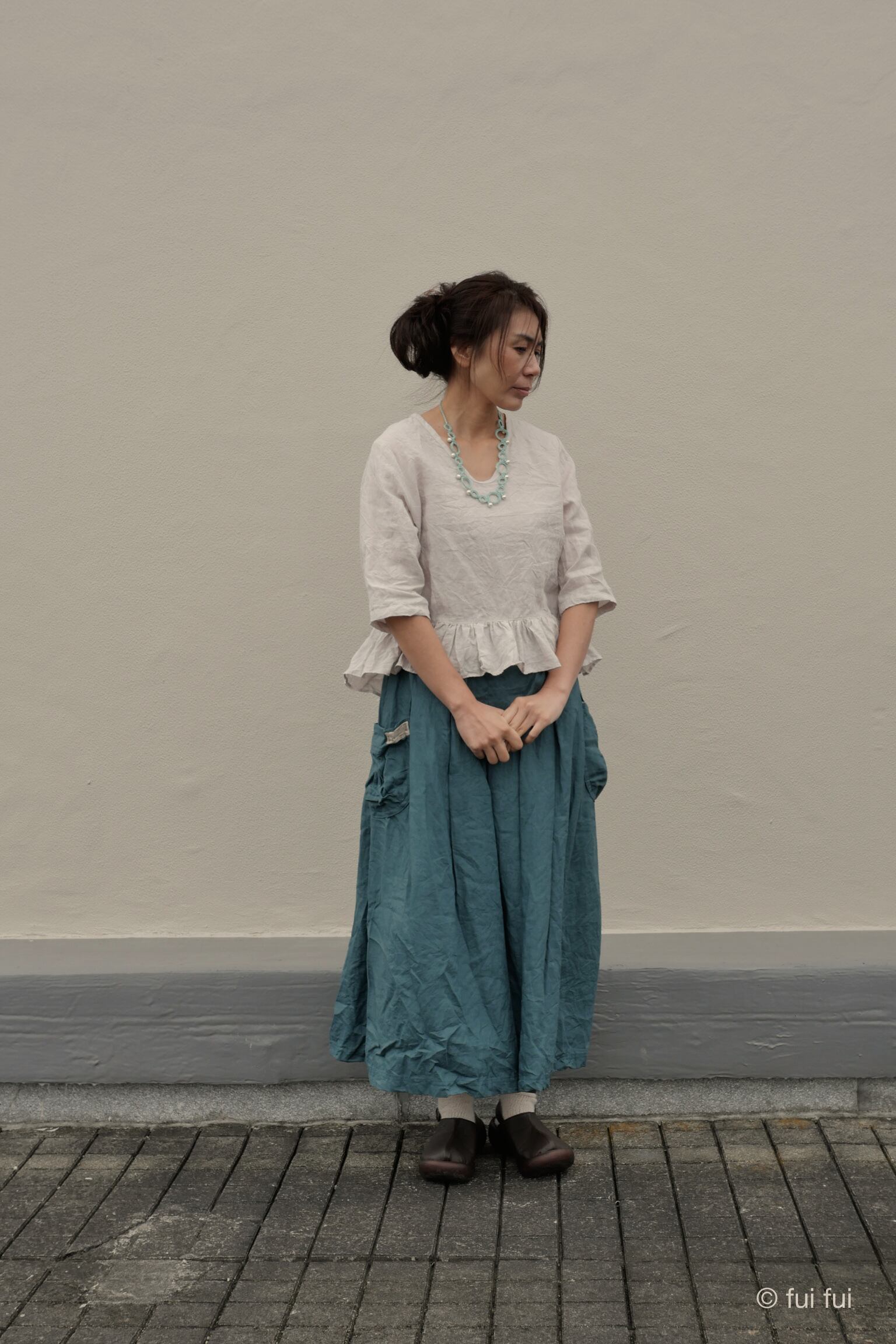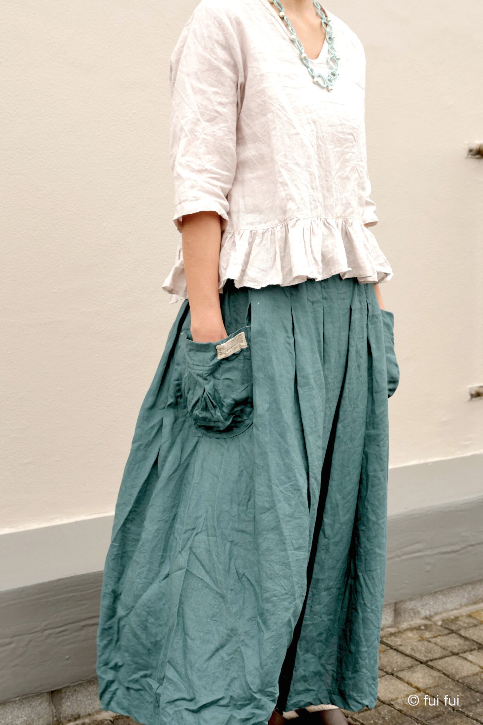 たっぷり布地を使用していますが腰回りまでのボックスプリーツ効果であまり広がらずにふんわりと落ち感がスッキリ綺麗です。