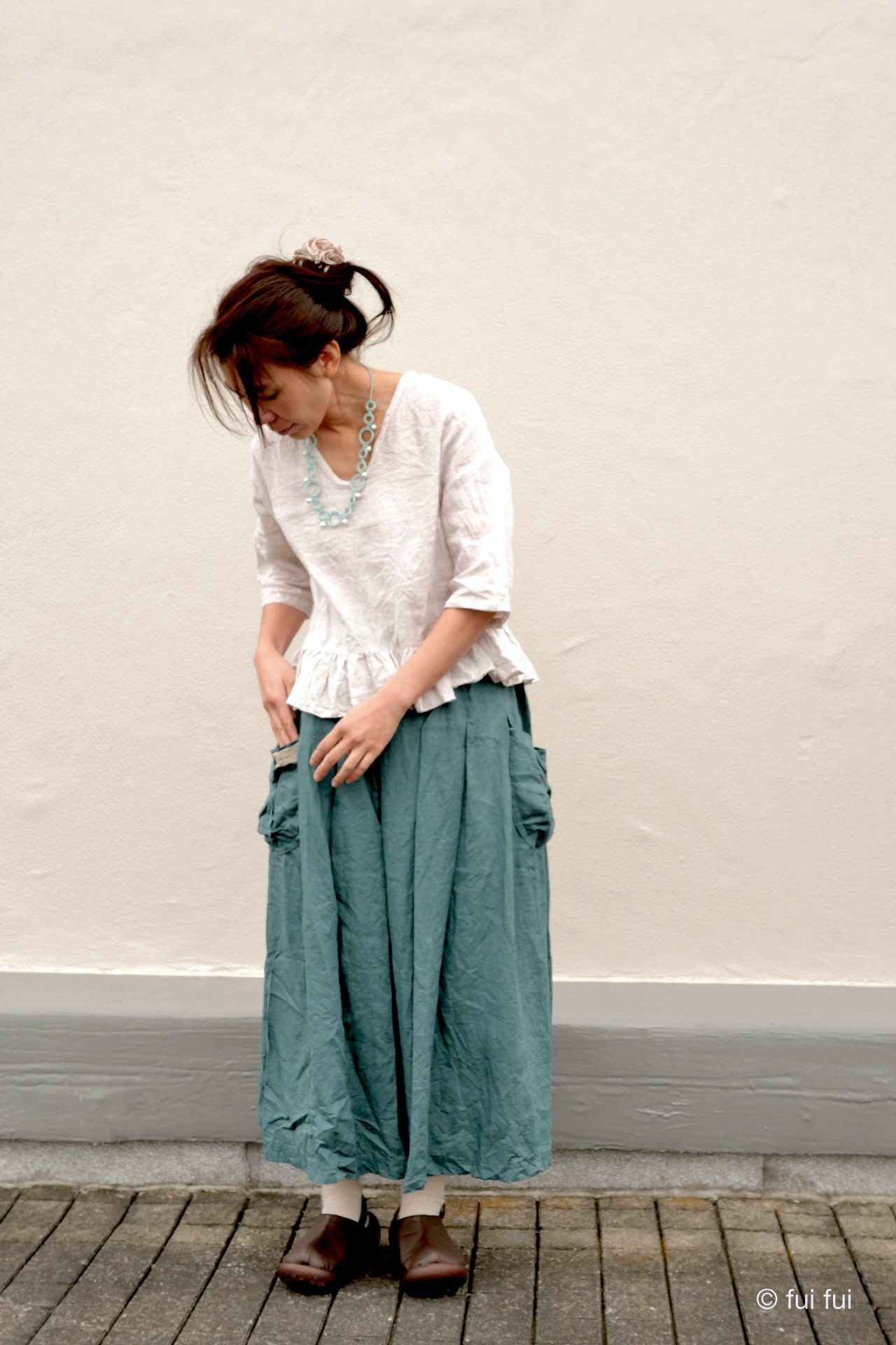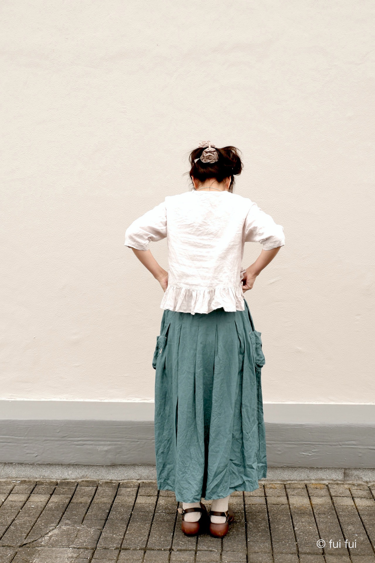 たっぷり布地を使用していますが腰回りまでのボックスプリーツ効果であまり広がらずにふんわりと落ち感がスッキリ綺麗です。